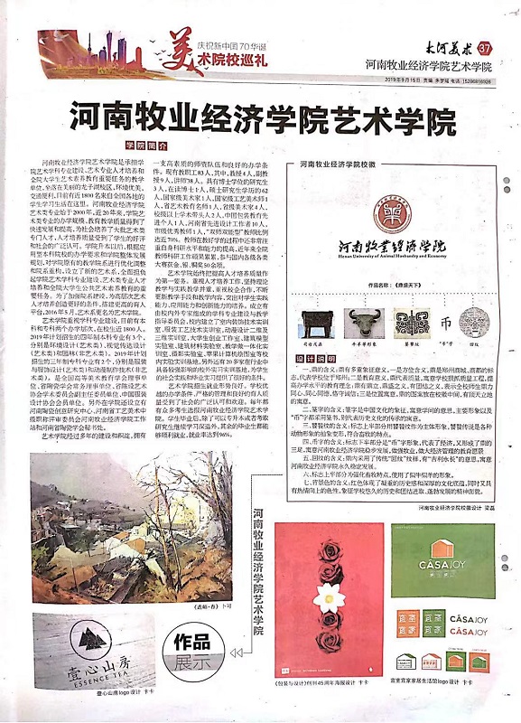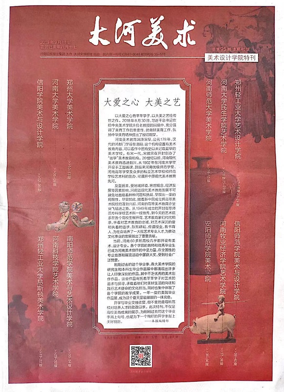 近日,《大河美术“美术设计学院特刊”》对我校beat365中文官方网站及教师作品进行了专版介绍,此次特刊一共报道省内十二所本科院校beat365中文官方网站的办学情况和师生作品。我校beat365中文官方网站简介被大量篇幅报道,其中,大师董晓峰代表作品陶瓷,卜可的绘画作品、粱磊和卞卡的设计作品以及黄一凡的书法作品也被一一刊登展示。