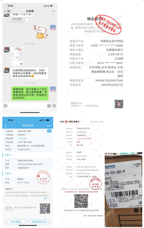 5月4日以来,郑州被新的一轮疫情席卷,形式严峻复杂,学校坚决落实上级相关疫情防控要求,统筹谋划、积极行动。学校的抗疫工作紧紧牵动着每个人的心,beat365中文官方网站13级人物形象设计专业毕业生王帅博同学情系母校,一听说母校疫情防控物资的储备存在缺口,立即积极行动起来,力所能及地为学校防控工作捐献爱心2000元。另外,17级园林专业学生陈璞,目前休学在家照顾生病的家人,得知学校物资短缺,5月7日就积极联系beat365官网,拿出了自己积攒的2000多元,购置了150套抗疫物资包捐赠到我校。还有beat365官网公共艺术教学部书画教研室身处开封的曲媛媛、蒋薇薇两位老师;服装教研室的刘雷老师,坚持线上教学严格指导论文答辩,自学校疫情防控的警报拉响,时刻关注关心学校。曲媛媛、蒋薇薇两位老师向学校爱心捐款共2000元,刘雷老师购置防疫口罩1万个助力学校疫情防控。