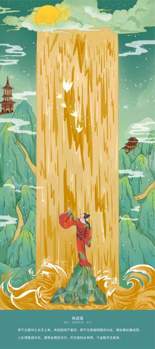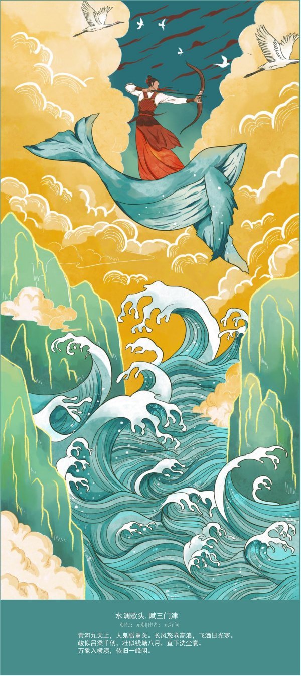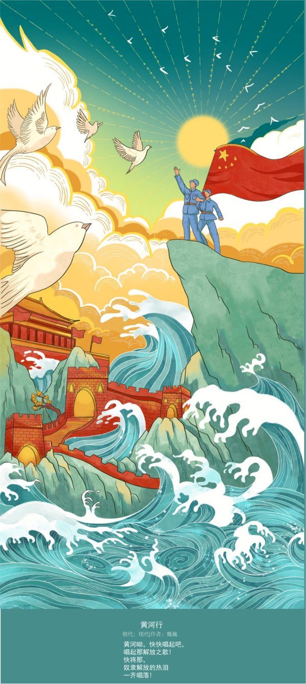 这组插画借鉴国画传统手绘线描描绘黄河的波澜壮阔,用造型装饰表现和现代电脑手绘结合,同时借鉴宋代画家王希孟的《千里江山图》里的青绿、赭黄为主色调,完美体现传统与现代绘画技艺、现实与浪漫主义风格的融合。这组插画不光选取了大家熟悉的唐代诗人李白的《将进酒》《西岳云台歌送丹丘子 》、王之涣的《凉州词》《登鹳雀楼》、唐代诗人柳中庸的《征人怨》,还有大家不太熟悉的元代元好问的《水调歌头·赋三门津》、现代作家魏巍的《黄河行》、现代不知作者姓名的现代诗《小浪底》等诗歌作品,不仅表现了古代黄河气吞山河的气势磅礴,还表现了现代黄河儿女改天换地、黄河两岸经济繁荣、安居乐业的场景,昂扬着中华民族生生不息、再现从古到今黄河文化的华彩篇章。同时也展现了beat365中文官方网站beat365中文官方网站在贯彻落实习近平总书记做出要“扎实推进黄河流域生态保护和高质量发展”的重要指示,不断提升专业教学质量,贴合时代精神、传承黄河文化创新发展的教学成果,更展现了我校师生在疫情防控常态化学习工作中,传承中国文化、奋发进取的精神风貌。