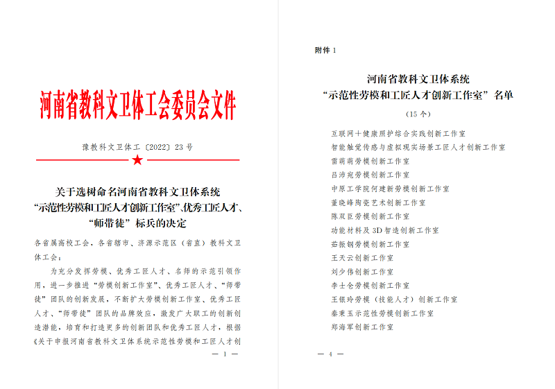 近日,河南省教科文卫体工会下发《关于选树命名河南省教科文卫体系统“示范性劳模和工匠人才创新工作室”的决定》文件,我校beat365中文官方网站“董晓峰陶瓷艺术创新工作室”获得此项殊荣。