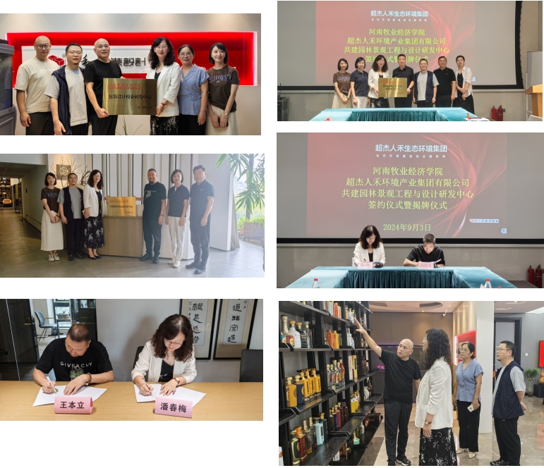 9月3日,学校科学技术处处长潘春梅、beat365中文官方网站党委书记杨莉、院长张鹏等一行六人前往超杰人和环境产业集团有限公司、河南西元绘空间设计有限公司、郑州九和包装设计有限公司等三家企业,举行“校企研发中心”揭牌仪式,与三家企业开展座谈,就下一步空间设计、园林景观工程与设计、包装设计等校企研发深度合作达成共识。