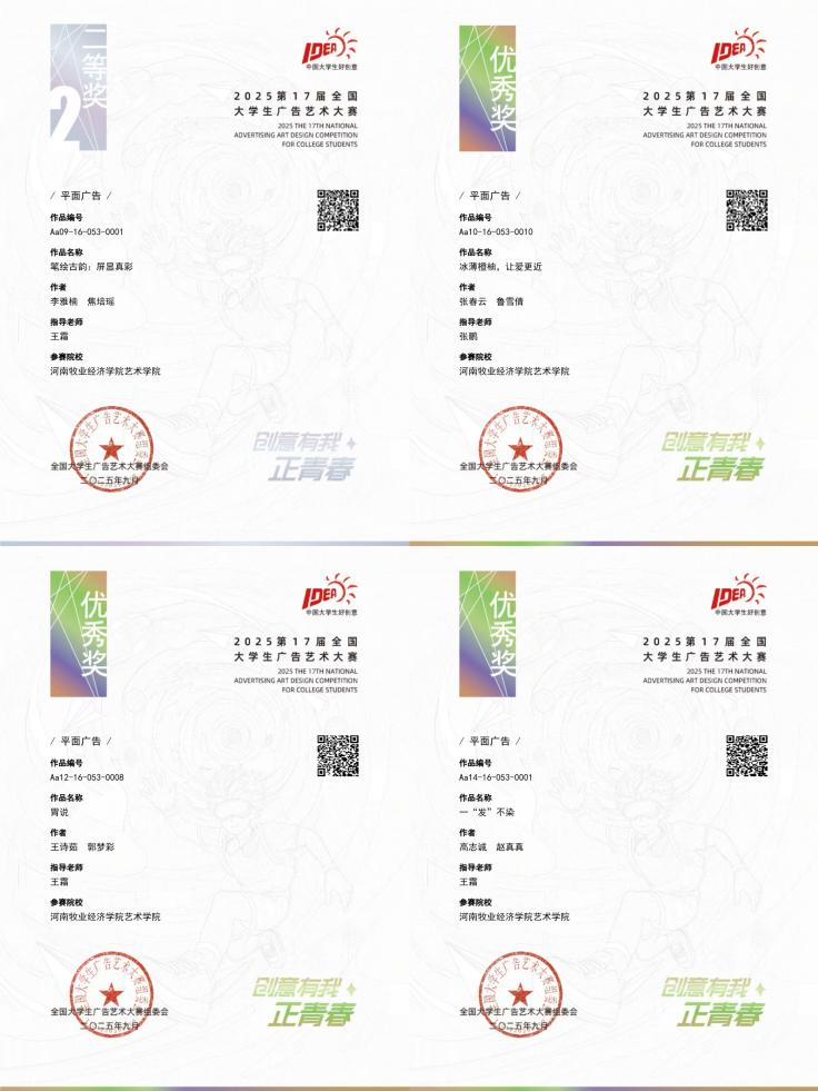 近日,第17届全国大学生广告艺术大赛获奖名单揭晓,我校艺术学院学子表现优异,从15件冲进国赛的省赛优秀作品中,一举斩获4项国家级大奖,其中,作品《笔绘古韵:屏显真彩》荣获国家级二等奖,作品《一“发”不染》、《胃说》及《冰薄橙柚,让爱更近》均荣获国家级优秀奖,成绩斐然。