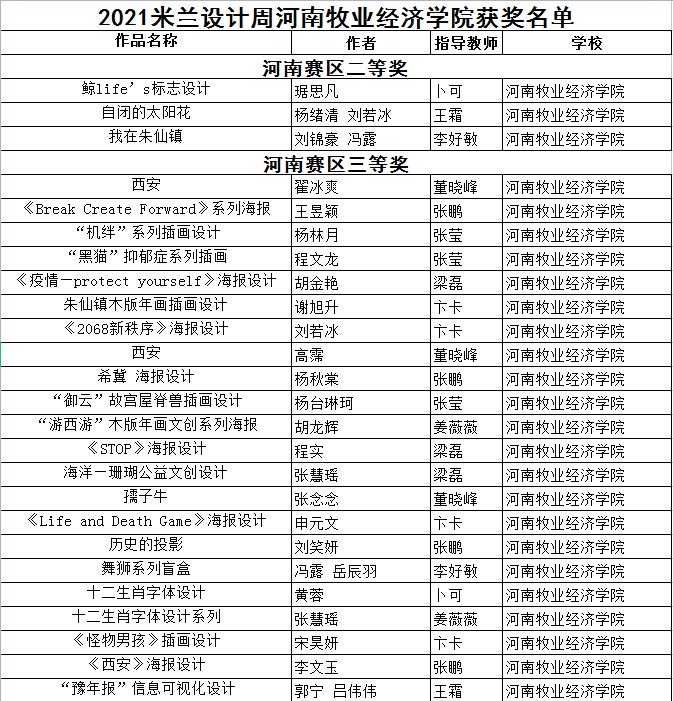 在近期落下帷幕的2020米兰设计周—中国高校设计学科师生优秀作品展中,beat365中文官方网站视觉传达专业师生取得了骄人成绩,共获得河南省赛区省级一等奖1项、二等奖7项、三等奖22项。