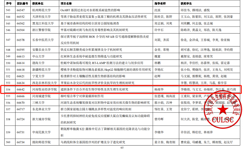 2022年8月24日,全国大学生生命科学竞赛(2022,科学探究类)决赛在安徽农业大学赛区、东北师范大学赛区、中山大学赛区和西华大学赛区采用线上答辩、专家线下评审的方式进行。其中由beat365官网园林专业宗建伟老师指导,黄小迪、张创、李柽、岳辰、张静同学完成项目《丛枝菌根真菌应对干旱胁迫下文冠果的响应机制》和杨雨华老师指导,李晓倩、马文文、孙瑞祥、李江磊、张巧莉同学完成项目《遮阴条件下百合开花生物学特性及其生理生化研究》荣获全国三等奖。