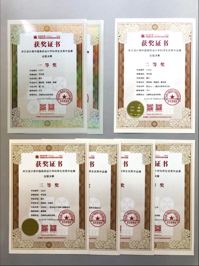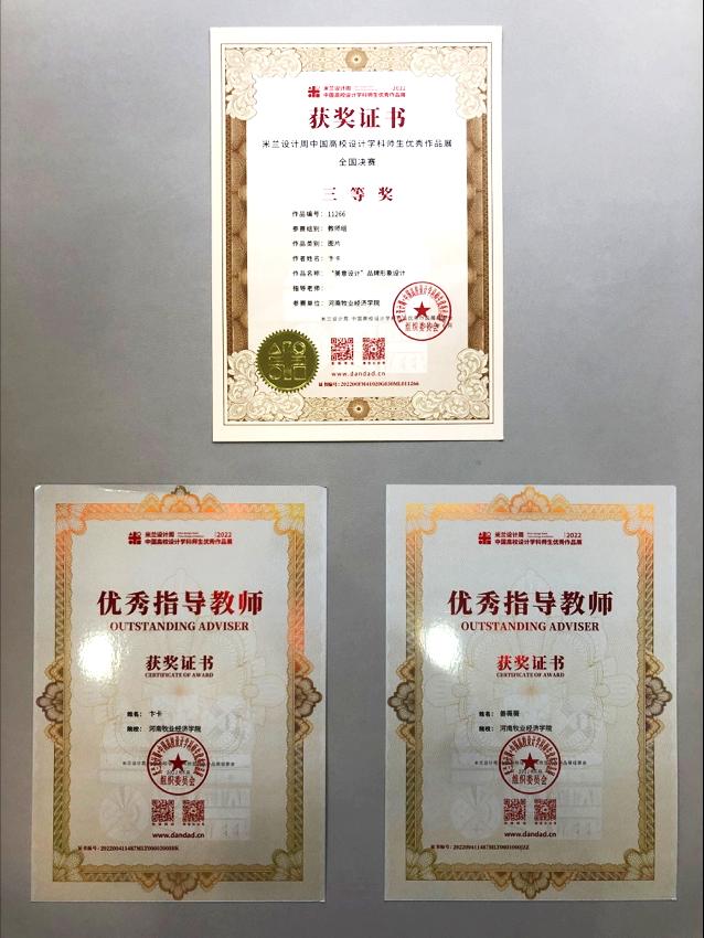 经过省赛的层层选拔,在近期落下帷幕的2022米兰设计周中国高校设计学科师生优秀作品展全国决赛中,视觉传达设计专业师生取得了骄人成绩,共获得教师组全国三等奖1项;学生组全国一等奖2项、二等奖1项、三等奖4项,两位老师获得优秀指导教师称号。