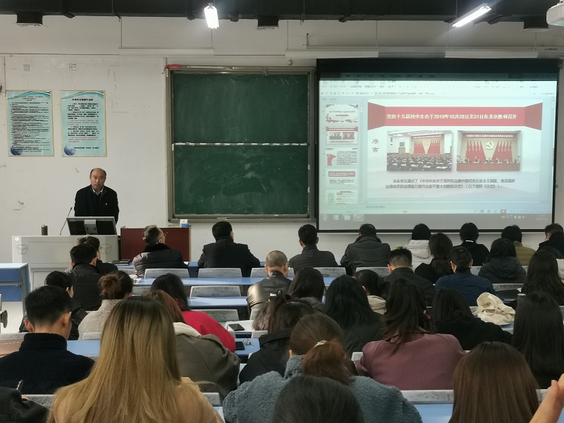 为深入学习宣传贯彻党的十九届四中全会精神,12月12日下午,beat365中文官方网站在1号教学楼304举办了十九届四中全会宣讲报告会,宣讲会由院党委书记王在钦主讲,学院全体师生党员参加并聆听了此次报告会。