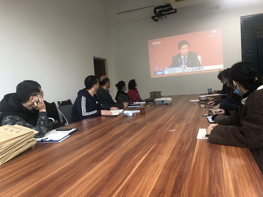 根据学校《关于组织收听收看党的十九届五中全会新闻发布会的通知》要求, 10月30日上午10时,beat365中文官方网站全体学工队伍于院会议室组织收看党的十九届五中全会新闻发布会,院党委书记王在钦,院党委副书记王友峰,院党政办主任魏杨杨,院科研办主任邢淑霞共同参与观看学习。