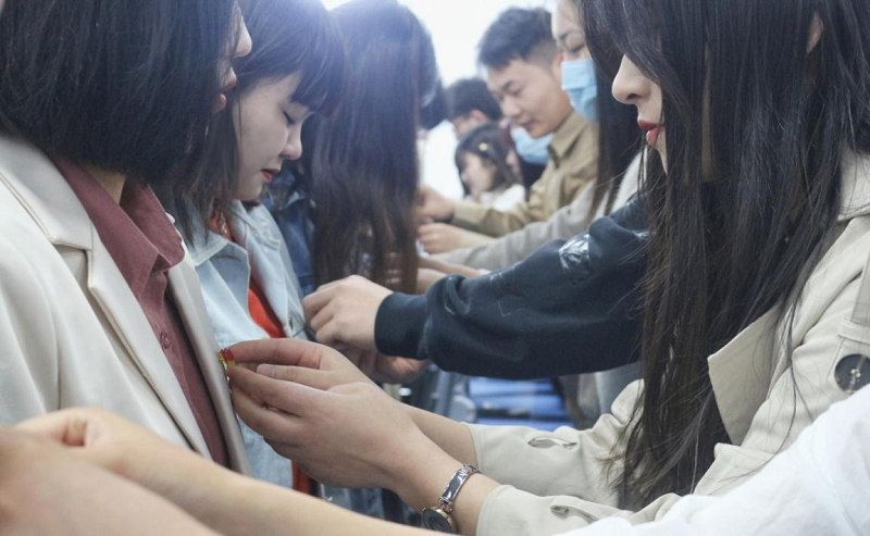 宣誓仪式在庄严肃穆的国歌中拉开序幕,韩飞老师首先介绍了仪式流程,并向大家宣读参加本次宣誓的新党员名单。随后所有参加宣誓的23名新党员起立脱帽,面对党旗,举起右手,齐肩握拳,随领誓人郝玲玉逐句跟读。誓言慷慨激昂,振奋人心,表达对党忠诚和愿意为共产主义事业奋斗终身的决心。宣誓结束后,由正式党员为新党员佩戴党员党徽。