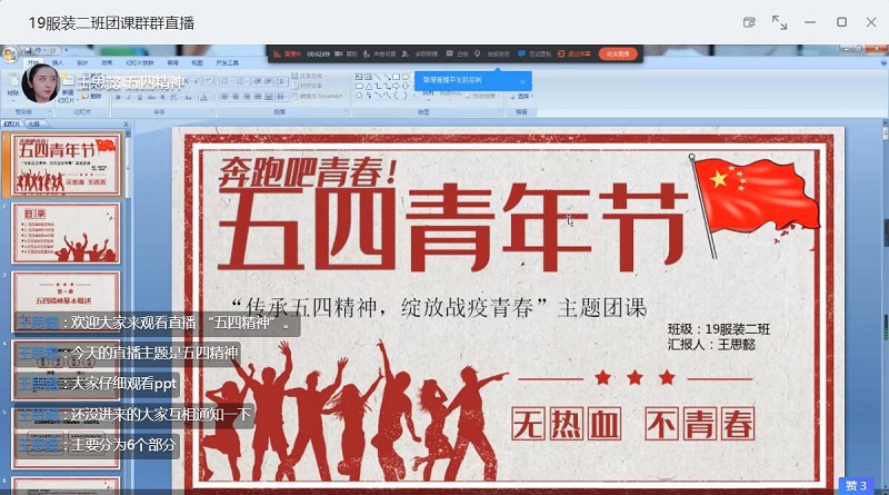 2020年4月27日,beat365中文官方网站beat365中文官方网站在钉钉会议群上举行了以“传承五四精神,绽放战役青春”为主题的团课班会,本次团课,由大一班级全体参与。