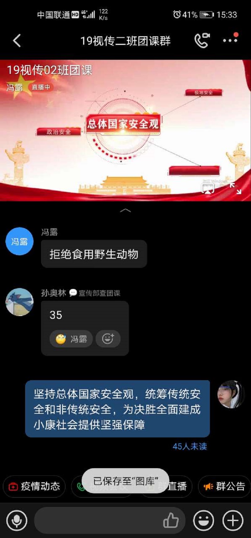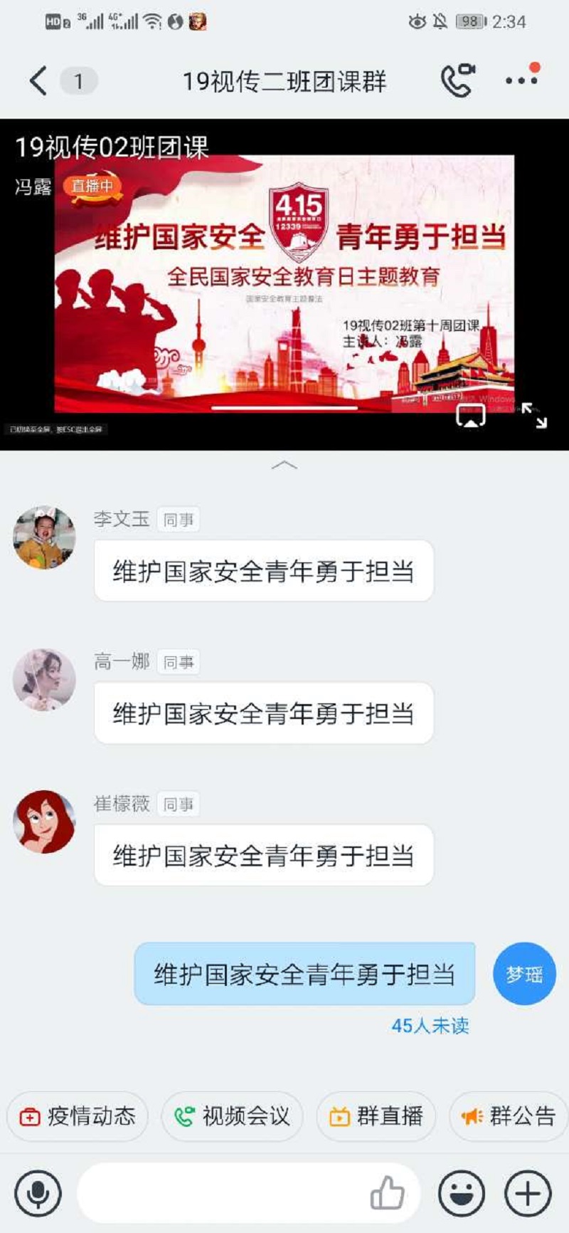 2020年4月15日下午,beat365中文官方网站beat365中文官方网站在钉钉会议上举行了以“维护国家安全,青年勇于担当”为主题的团课,本次团课,由大一全体班级参加。